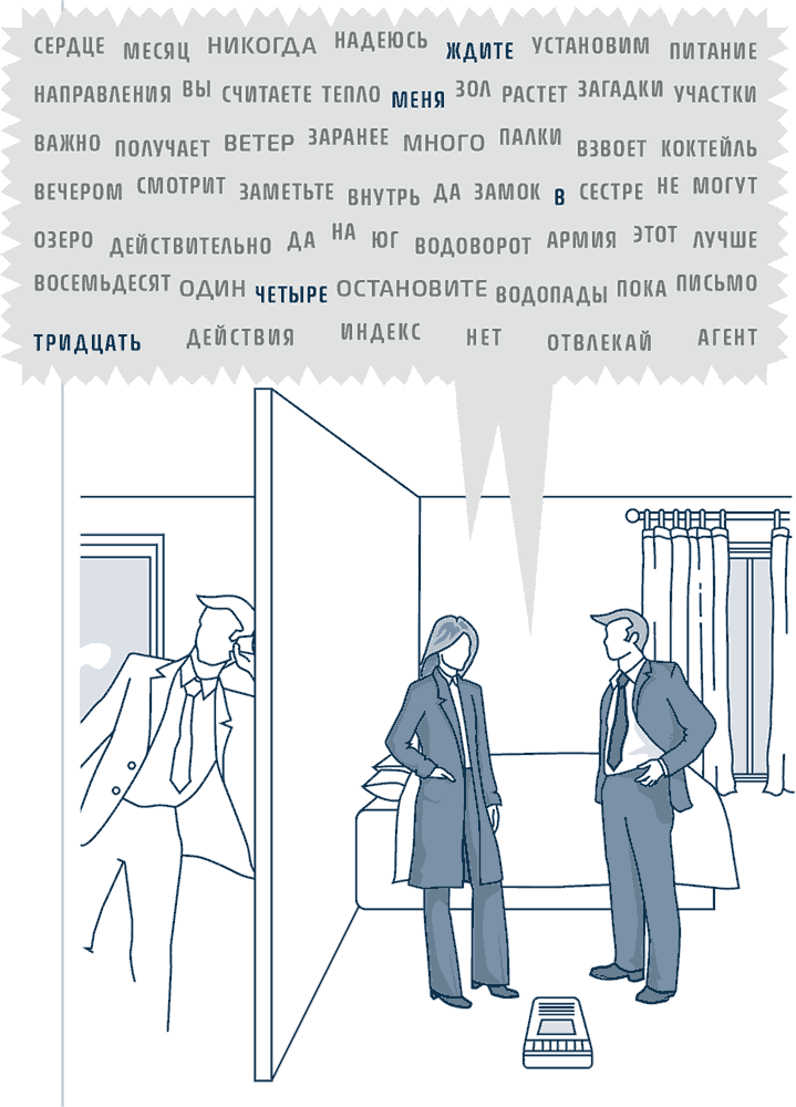 Суть этого метода состоит в том, чтобы наполнить помещение, где ведутся тайные переговоры, – номер отеля, кабинет, конференц-зал или салон автомобиля – записанной и проигрываемой на магнитофоне путаницей звуков и слов. Ваши секреты будут надежно защищены от подслушивания, потому что такую записанную тарабарщину невозможно отфильтровать никакими методами обработки записей.