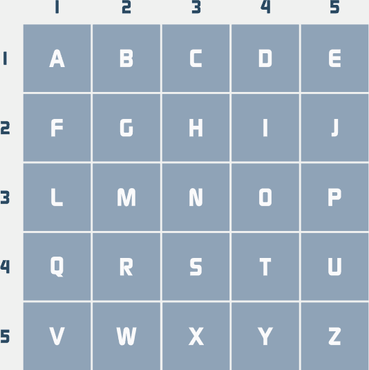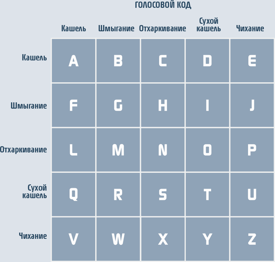 Придумали эту систему американские военнопленные, захваченные во Вьетнаме. Им было запрещено переговариваться друг с другом, но очень хотелось найти способ тайно общаться. Один из офицеров вспомнил, что во время Второй мировой войны узники разработали код, состоящий из постукиваний вместо точек и тире азбуки Морзе. (Это было необходимо, так как невозможно передать тире стуком в стену.) Этот код был основан на матрице 5 х 5. Каждая буква зашифровывалась двумя числами, которые выстукивались с паузой между ними: первое обозначало положение в строке, а второе – положение в столбце.