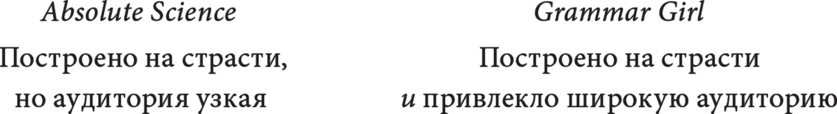 Прежде чем запустить успешный проект Grammar Girl, я создала подкаст о науке под названием Absolute Science. Мне нравилось делать это шоу, я была им просто поглощена. На его продвижение я потратила гораздо больше сил, чем на Grammar Girl. И хотя Absolute Science был достаточно известен, через год я поняла, что он никогда не принесет дохода, способного оправдать потраченное на него время.