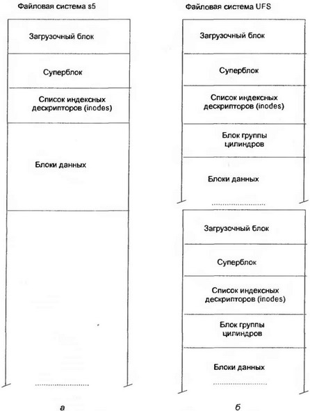 Рис. 8.9. Структура файловых систем s5/ext2fs (а) и UFS (б)