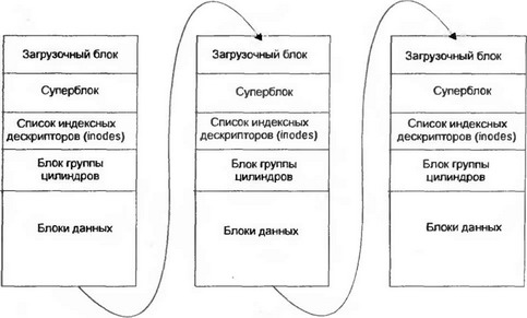 В начале раздела расположен загрузочный сектор, затем следует суперблок, за которым находится одна или несколько групп цилиндров (рис. 8.10). Для перестраховки копия суперблока дублируется в каждой группе. Загрузочный сектор не дублируется, но по соображениям унификации и единообразия под него просто выделяется место, таким образом, относительная адресация блоков в каждой группе остается неизменной.