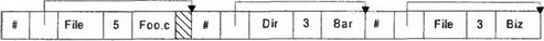 Имена файлов хранятся в каталогах (рис. 8.12). В индексных дескрипторах их нет. С точки зрения UFS, каталоги являются файлами особого типа и могут храниться по любому адресу, принадлежащему группе цилиндров. Файловая система UFS поддерживает несколько типов хеширования каталогов, однако на структуре хранения имен это никак не отражается. Имена хранятся в блоках, называемых DIRBLKSIZ, в структурах типа direct, выровненных по 4-х байтной границе.