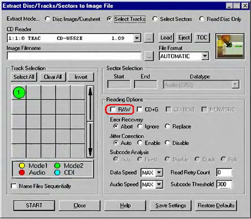 Однако попытка просмотра оглавления только что записанного диска штатными средствами операционной системы ни к чему хорошему не приводит, и нас пытаются убедить в том, что данный диск пуст. Но ведь это не так! Запускаем CDRWin, выбираем Extract Disc/Tracks/Sectors to Image File, и в окне Track Selection видим наш трек TRACK 1 (рис. 10.19). Хотите его проиграть? Установите переключатель Select Track, а в группе Reading Options сбросьте флажок RAW (если этого не сделать, содержимое трека будет читаться в сыром режиме, с перемешиванием полезных данных с заголовками, что никак не входит в наши планы). Выбираем трек, который требуется извлекать, и, выбрав номинальную скорость чтения, нажимаем кнопку START (чтение трека, записанного в MODE 2 на максимальной скорости, зачастую приводит к многочисленным ошибкам).