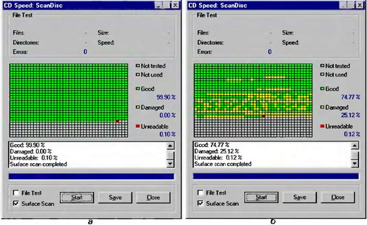 Рис. 10.22. Диск Verbatim (а), записанный на приводе Teac 552Е, демонстрирует высочайшее качество записи, подходящее для записи в режиме MODE 2. Диск от безымянного производителя (б), записанный на том же приводе, содержит большое количество разрушенных секторов, и для записи в режиме MODE 2 не годится