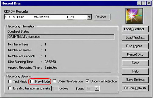 Среди программ, поддерживающих запись диска в режиме MODE 2, в первую очередь следует выделить утилиту CDRWin, пользующуюся неизменной любовью профессионалов. Это – чрезвычайно мощный инструмент, возможности которого ограничены лишь фантазией пользователя, выполняющего запись. Самую свежую версию программы можно скачать, в частности, отсюда: http://www.goldenhawk.com/download_body.htm. Кроме того, пригодится и консольная версия программы, управляемая из командной строки, которая также имеется на сайте http://www.goldenhawk.com.