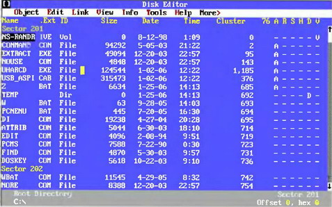 Лучшим, и, кстати говоря, до сих пор никем не превзойденным, дисковым редактором, когда-либо созданным за всю историю существования IBM PC, был и остается знаменитый Norton DiskEditor от компании Symantec (см. рис. 2.2 и 2.3). Этот редактор обеспечивает удобную навигацию по диску, возможность просмотра большинства служебных структур в естественном виде, а также мощный контекстный поиск. Эти возможности до предела упростили процедуру восстановления, взяв всю рутинную работу на себя. Старичок и поныне остается в строю. Разумеется, под Windows NT он не запускается, однако работает под MS-DOS и Windows 9x, наследуя все ограничения, накладываемые BIOS на предельно допустимый объем диска в 8 Гбайт.