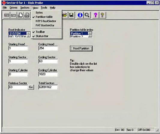 Редактор Microsoft Disk Probe входит в состав бесплатно распространяемого пакета Support Tools. Этот редактор незатейлив и довольно неудобен в использовании. Если все, что вам требуется – это подправить пару байт в нужных секторах, Disk Probe вполне подойдет, но для восстановления серьезных разрушений он непригоден. Тем не менее, им поддерживаются следующие базовые функции редактирования: