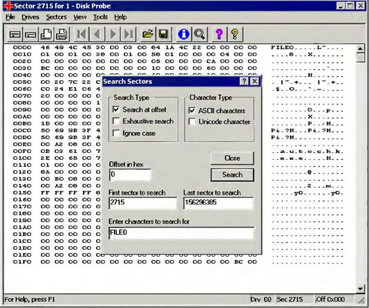 □ глобальный поиск по фиксированному или произвольному смещению строки от начала сектора;