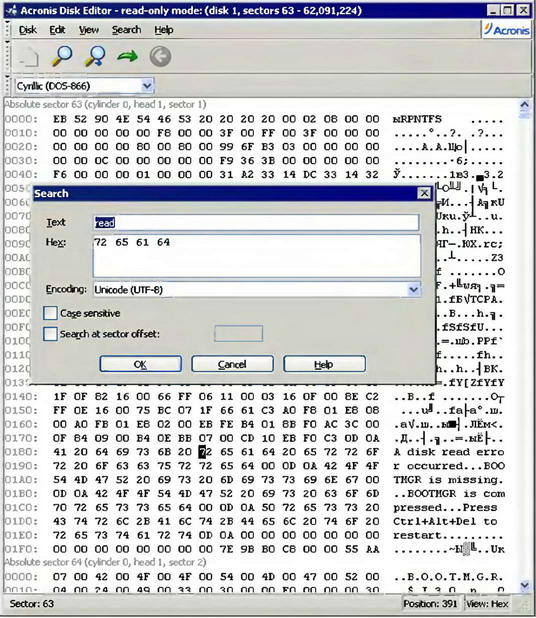 Рис. 2.6. Acronis Disk Editor за поиском строки