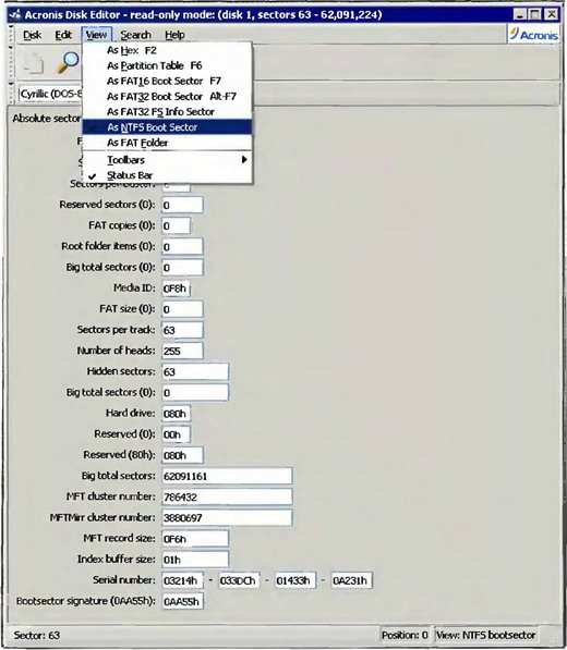 Рис. 2.7. Acronis Disk Editor отображает загрузочный сектор NTFS