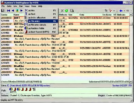 С его помощью можно просматривать все основные структуры NTFS в естественном виде, монтировать виртуальные диски, работать с образами лазерных и жестких дисков, перемещаться по каталогам, восстанавливать удаленные файлы из любой записи MFT, копировать файлы (и даже целые каталоги) с возможностью предварительного их просмотра в текстовом или шестнадцатеричном формате. И это еще далеко не все! Редактор предоставляет удобную систему навигации (приблизительно такую же, как в браузере или IDA PRO, включая поддержку гиперссылок), изобилие горячих клавиш, а также поддерживает историю переходов. Кроме того, он реализует мощную систему поиска с поддержкой основных структур (INDEX, MFT, Partition) и предоставляет возможность поиска ссылок на текущий сектор. С его помощью можно производить удаленное восстановление диска с подключением по TCP/IP, локальной сети или прямому кабельному соединению. Все числа выводятся в двух системах счисления – шестнадцатеричной и десятичной.