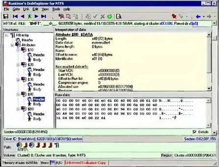 Короче говоря, это мой основной (и при том горячо любимый!) инструмент для исследования файловой системы и восстановления данных. Первое же знакомство с ним вызывает эйфорию, граничащую со щенячьим восторгом. Наконец-то мы получили то, о чем так долго мечтали. Естественно, за все хорошее надо платить. Полнофункциональная версия Runtime's Disk Explorer – это коммерческий продукт. Его демонстрационная версия, доступная для скачивания, лишена возможности записи на диск. Причем имеются две различные версии редактора: одна поддерживает NTFS (http://www.runtime.org/diskexpe.htm), другая – FAT. Помимо этого, существуют и плагины для Bart's РЕ, которые можно скачать с сайта Runtime Software.