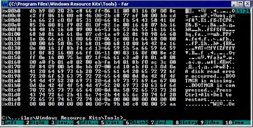 Данный инструмент входит в бесплатно распространяемый фирмой Microsoft пакет Windows Resource Kit. Он представляет собой пакетную утилиту для чтения и записи отдельных секторов в файл. Sector Inspector (рис. 2.10) поддерживает режимы адресации LBA и CHS. При запуске без параметров он выводит декодированную таблицу разделов вместе с расширенными разделами и загрузочными секторами. Редактирование диска осуществляется путем правки предварительно сохраненного дампа сектора в любом подходящем HEX-редакторе с последующей записью исправленной версии на диск. Естественно, это непроизводительно и неудобно, однако Sector Inspector – это единственный известный мне редактор, поддерживающий работу из Recovery Console. Именно поэтому в некоторых случаях он бывает просто незаменим!