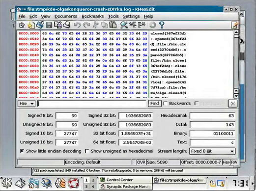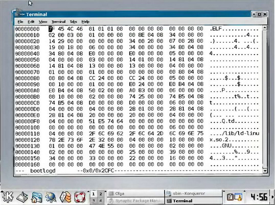 Какой редактор выбрать? В общем-то, это дела вкуса (причем, не только вашего, но еще и составителя дистрибутива). Одни предпочитают консольный редактор hexedit (рис. 2.12), другие тяготеют к графическому редактору khexdedit (рис. 2.13), а третьи выбирают BIEW (урезанная версия всем известного редактора HIEW).