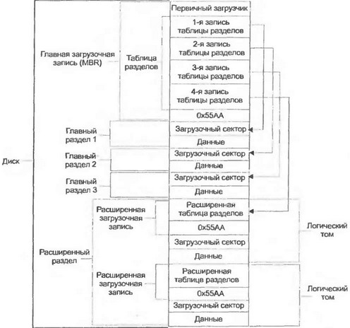 Первые жесткие диски имели небольшой размер и форматировались практически так же, как и дискеты. Однако их объемы стремительно росли, и MS– DOS была уже не в состоянии полностью их адресовать. Для преодоления этого ограничения был введен механизм разделов (partitions), позволяющий разбивать один физический диск на несколько логических. Каждый из логических дисков имеет собственную файловую систему и форматируется независимо от других. За счет чего это достигается?