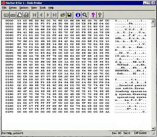 Воспользовавшись любым редактором диска (например, Microsoft Disk Probe из комплекта Resource Kit), считаем первый сектор физического диска. Он должен выглядеть приблизительно так, как показано на рис. 5.4.