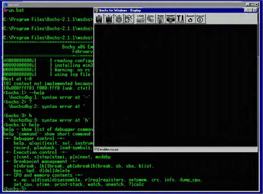 Отлаживать код загрузчика невероятно трудно. Загрузчик получает управление задолго до запуска операционной системы, когда никакие отладчики еще не работают. Несколько лет назад это представляло огромную проблему, и при разработке "навороченных" загрузчиков приходилось либо встраивать в них интегрированный мини-отладчик, либо выискивать ошибки вручную, изучая листинги с карандашом в руке. С появлением эмуляторов все изменилось. Достаточно запустить такой эмулятор, как BOCHS (рис. 5.5), и вы сможете отлаживать загрузчик как и любую другую программу!