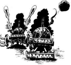 Третий монстр был оборудован подвижными острыми косами, срезающими всё на своём пути. Каждая адская машина была снабжена топкой, в которой энергия лафового дерева преобразовывалась в движущую силу. Из высоких дымовых труб валил густой, едкий дым.