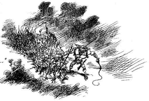 Плут нашёл Лагу, Уорпа, Триста и Треббиса в центре строя. Времени на праздные беседы у них не осталось. Зловещий шум, напоминающий грозный рык невиданного чудовища, становился всё более отчётливым.