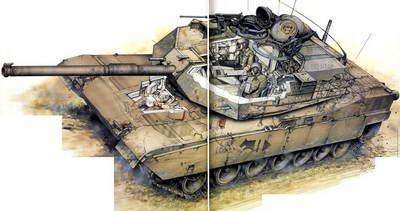 Подвеска торсионного типа состоит по каждому борту из семи опорных и трех поддерживающих катков, ведущего колеса впереди и направляющего сзади. В состав стандартного оборудования входят система автоматического пожаротушения мотор– но-трансмиссионного отделения, климатическая система на основе фильтровентиляционной установки с кондиционированием и отоплением воздуха, а также приборы ночного видения пассивного типа для водителя.