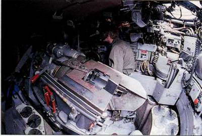 Внизу. В башне расположены три из четырех членов экипажа танка. Слева от казенной части орудия находится место командира, справа – заряжающего и впереди него – наводчика. Сиденье наводчика специальное, позволяющее неотрывно наблюдать за целью в прицел вне зависимости от колебаний, тряски и вибрации корпуса при движении по неровной местности.