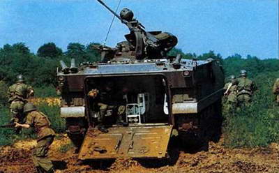 Французские пехотинцы покидают БМП АМХ– 10Р через кормовую аппарель. На базе АМХ– 10Р создано целое семейство машин, включающее командно-штабную, ремонтную и санитарную машины, самоходный ПТРК, тягач для миномета, машины артиллерийской разведки, передовых артиллерийских наблюдателей и с тяжелым вооружением.