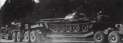 В кормовой части корпуса этого Т-62, транспортируемого на прицепе тяжелым тягачом, видны дополнительные бочки с топливом, что позволяет увеличить запас хода.