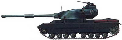 Вид сбоку тяжелого танка «Конкурор» со 120-мм пушкой. Орудие применяло боеприпасы раздельного заряжания, в задней верхней части башни видна командирская башенка, в которой устанавливали дальномер и 7, 62-мм зенитный пулемет.