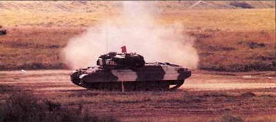 Танк «Виккерс» Mk 1 с развернутой вправо башней ведет огонь из 105-мм нарезной пушки 17 в ходе показательных стрельб на полигоне британских бронетанковых войск. Такие танки поставлялись в Кувейт и Индию, в Индии на них впоследствии установили дизельные двигатели фирмы «Детройт».