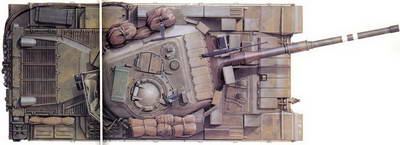 Механик-водитель располагался в передней части корпуса справа, слева от него находилась боеукладка. В центре корпуса – боевое отделение с поворотной башней, в корме – моторно-трансмисси– онное отделение. Командир размещался в задней части башни по центру и имел свою башенку, чуть впереди и слева от него – заряжающий, впереди и справа – наводчик. Основное вооружение включало 120-мм нарезную пушку с углами наведения по вертикали от -7° до +15°, системой стабилизации и боекомплектом 35 выстрелов раздельного заряжания(бронебойные и осколочно-фугасные). Стреляные гильзы выбрасывались на ружу через специальный люк по правой стороне башни. Дополнительное вооружение состояло из спаренного 7,62-мм пулемета и зенитного такого же калибра, установленного на командирской башенке.