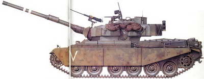 В 1950-1960-х годах в Израиль из Великобритании было поставлено более 1000 танков «Центурион» с 83,8-мм пушкой, но в конце 1960-х израильтяне решили оснастить эти машины более мощными нарезными орудиями L7 калибра 105 мм. Кроме того, израильских танкистов не устраивал установленный на таких танках бензиновый двигатель «Метеор» фирмы «Роллс-Ройс», который не обеспечивал необходимую удельную мощность, имел большой расход горючего и многочисленные проблемы с системами охлаждения и фильтрации воздуха. С 1970 года на вооружение израильских танковых войск стали поступать модернизированные танки «Центурион« с дизельным двигателем, увеличенным объемом топливных баков, усовершенствованной тормозной системой, автоматической трансмиссией, новой электросистемой и модифицированной боеукладкой. В состав дополнительного вооружения вошли два 7,62-мм пулемета, а также пулемет калибра 12,7 мм. Такие танки участвовали в операции, проведенной израильской армией в Ливане в 1982 году. На рисунке (вид сбоку) показаны характерные для израильской армии опознавательные знаки – изображен танк 2-й роты 3-го батальона, о чем свидетельствуют две белые полосы на стволе и большая белая буква V в передней части бортового противокумулятивного экрана соответственно.