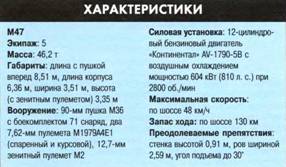 Башня и корпус М47 были сварными. В передней части броневого корпуса размещались механик-водитель и стрелок из курсового пулемета, во вращающейся на 360° башне – три члена экипажа (командир, наводчик и заряжающий), в корме танка – моторно-трансмисси– онное отделение. Основное вооружение включало 90-мм пушку (углы возвышения от – 5° до +15°), дополнительное – 7,62-мм спаренный пулемет (слева от пушки) и курсовой такого же калибра в передней правой части корпуса.