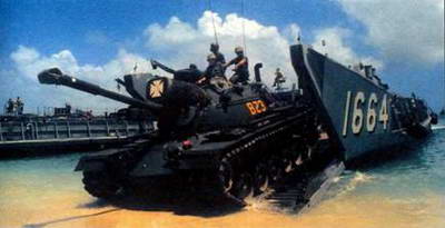 Слева. Высадка М48 с борта танкодесантного корабля. При установленном оборудовании для подводного вождения М48 способен преодолевать по дну водные преграды глубиной до 4,4 м.