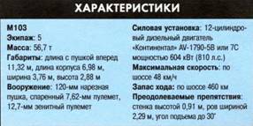 По своей компоновке и форме М103 являлся увеличенной копией М48. В башне размещались четыре члена экипажа – командир по центру сзади (он имел башенку с установленным на ней 12,7-мм зенитным пулеметом М2НВ), слева от казенной части орудия находился заряжающий, справа – наводчик и еще один заряжающий. Ходовая часть включала торсионную подвеску, по бортам были установлены по семь опорных сдвоенных об– резиненных катков, шесть поддерживающих роликов, ведущее колесо сзади и направляющее впереди. Основное вооружение включало 120-мм нарезную пушку с углами наведения по вертикали от -8° до +15°, установленную во вращающейся на 360° башне.