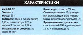 АМХ-30 – самый легкий среди всех ОБТ, созданных в странах НАТО в конце 1950-х годов. Корпус машины литой, а башня сварная. Вооружение включало 105-мм нарезную пушку, 20-мм спаренную пушку и 7,62-мм пулемет, установленный в командирской башенке. Особенностью спаренной пушки было то, что ее можно было наводить по вертикали независимо от основного орудия, на угол до +40°, что позволяло использовать ее для борьбы с низколетящими воздушными целями. Боекомплект включал 47 снарядов калибра 105 мм (19 в башне и 28 в корпусе), 1050 20-мм снарядов и 2050 патронов к пулемету. В боекомплект основной пушки входили осколочно-фугасные, бронебойные, дымовые и осветительные боеприпасы, а позднее – и подкалиберные с начальной скоростью полета 1525 м/с, способные пробить броню толщиной до 150 мм под углом 60° на дальности 5000 м. Позднее по заказу Катара и Саудовской Аравии (для действий в условиях пустыни) была разработана моди фикация AMX-30S, а для танковых частей Франции – АМХ-30 В2 с усовершенствованной системой управления огнем (с лазерным дальномером и ТВ-системой) и новой трансмиссией.