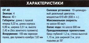 В передней части корпуса разместили отделение управления, в средней – боевое отделение, в корме – моторно– трансмиссионное. Основное вооружение – 105-мм нарезная пушка, после выстрела поддоны гильз автоматически выбрасываются в специальный мешок в нижней части боевого отделения, под казенной частью орудия. Боекомплект включал 61 выстрел, 42 из которых находились в боеукладке слева от механика-водителя и остальные – в башне. Дополнительное вооружение состояло из спаренного и зенитного пулеметов калибра 7,62 мм. По бортам башни установили по четыре дымовых гранатомета. В OF-40 применили систему управления огнем OG14LR с лазерным дальномером. Командир танка имел стабилизированный прицел, который можно было использовать и для наблюдения. Стандартная комплектация включала систему защиты от ОМП и приборы ночного видения меха ника-водителя. В модификации OF-40 Mk 2 установили усовершенствованную систему управления огнем OG14L2A. Дубай заказал 18 таких танков и три БРЭМ на шасси OF-40, а также модернизировал 18 поставленных ранее базовых моделей до уровня Mk 2.