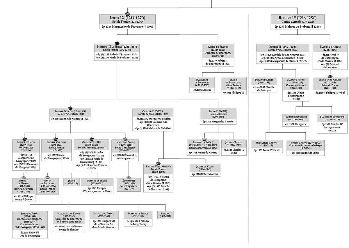 Хотя у этих трех королей не было наследников мужского пола, не все они умерли без потомков. Последние, хотя и были исключительно женского пола, имели достойную их происхождения судьбу. Жанна Наваррская, дочь Людовика X, неудачливая претендентка на французский трон, вышла замуж за сына Людовика д'Эврё, Филиппа. В 1328 году, после смерти Карла IV, она добилась признания своих прав на Наваррскую корону и правила этим королевством до своей смерти в 1349 году. Старшая дочь Филиппа V и Жанны Бургундской, Жанна Французская, в 1318 году, вышла замуж за Эда IV, герцога Бургундского. После смерти матери она унаследовала графства Артуа и Бургундию. Затем после смерти Жанны в 1347 году эти графства перешли к ее младшей сестре, Маргарите Французской, жене графа Фландрии, которая владела ими до своей смерти в 1382 году. Изабелла Французская, третья дочь Филиппа V, вышла замуж за дофина Вьеннского, а овдовев, снова вышла замуж за сеньора де Фокони. Она умерла в 1348 году. Бланка оставалась монахиней в Лоншане, где и умерла в 1358 году. Бланка Французская, посмертная дочь Карла IV, вышла замуж за младшего сына короля Филиппа VI, Филиппа, первого герцога Орлеанского и умерла в 1393 году. Даже если кровь Капетингов продолжала давать Франции принцев, престиж династия Валуа с ее блестящими дворами и прославленными королями вскоре заставил забыть этих последних Капетингов, которые умерли слишком рано. Они не были хорошо известны, и к ним плохо относилась историография, но, тем не менее, они завещали королевству фундамент, на котором в течение долгого столетия войны будет строиться французская нация[306]306