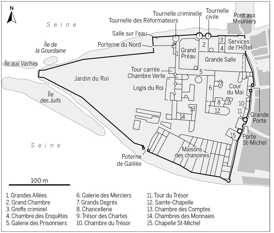 GUÉROUT, Jean, "Le Palais de la Cité à Paris, des origines à 1417. Essai topographique et archéologique", Mémoires de la Fédération des Sociétés historiques et archéologiques de Paris et de l'Île-de-France, vol. 1 (1949), p. 57–212.