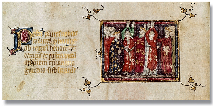 Английский король Эдуард II, которого можно узнать по золотым леопардам на его тунике, и король Филипп IV посвящают принцев Карла, Филиппа и еще нескольких молодых людей в рыцари на Троицу 1313 года.