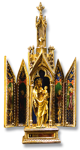 Этот реликварий был подарен Филиппом V и его женой неизвестному получателю, вероятно, религиозному учреждению. Король и королева изображены стоящими на коленях и молящимися по обе стороны от золотой статуэтки Богородицы и Младенца Христа. Реликварий является свидетельством королевского покровительства и важности почитания культа Девы Марии в XIV веке.
