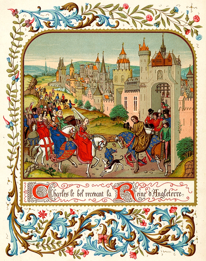 На этой миниатюре, прежде всего, интересен облик средневековых городов, четко отделенных от окружающей сельской местности своими крепостными стенами. Здесь также показано, как выглядел королевский эскорт. Венценосные брат и сестра изображены едущими на лошадях, покрытых попонами с геральдическими символами. Королева Англии едет впереди внушительного свиты, а Карла IV сопровождают его самые доверенные советники и слуги. Миниатюра из Хроники Фруассара (Chroniques de Jean Froissart), иллюминированной в мастерских Луассе Льеде.