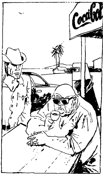 Единственным признаком жизни оказалась бензоколонка на самой дальней окраине вымершего городка. Никакой броской рекламы, просто в землю врыт щит с надписью: «Харки: бензин по дешевке». Перед приземистым оштукатуренным гаражиком торчит одна колонка; у допотопной стойки-шатра «Кока-кола» немыслимых габаритов толстяк в нижней рубахе сидел за грубым, кособоким складным столиком. Отпивал из пластиковой чашечки и курил. Завернув к колонке, Филип притормозил у самого столика. Голова толстяка была покрыта какой-то серой тряпкой, должно быть, от солнца. На Филипа он не обращал ни малейшего внимания.