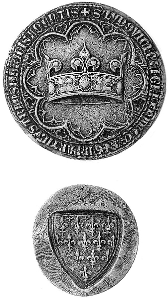Печать, использовавшаяся регентами королевства в 1270 году. Вверху – сама печать: корона с зубцами в виде флер-де-лис и легендой Signum Ludovici Dei gr[acia Francor[um\ reg[is], in partibus transma-rinis agentis (Печать Людовика, милостью Божьей, короля франков, пребывающего в заморских землях). Внизу – оборотная сторона печати, которую специалисты называют контр-печатью: щит с несколькими флер-де-лис.