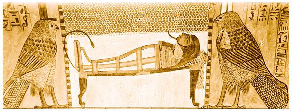 Исида и Нефтида в обликах пустельг рядом с мумией. Изображение из гробницы Сеннеджема в Дейр эль-Медине. Новое царство, XIX династия.