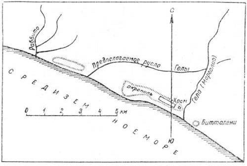 Плато, выбранное поселенцами, представляло собой каменный, покрытый песком, прямоугольный массив, подымавшийся (на 50 м над ур. м.) над раскинувшейся позади его равниной. Длина этого плато равнялась 4000 м, ширина 500-700 м. Стены плато круто обрывались вниз, оставляя лишь узкий проход к морю с южной стороны. С него открывался вид на внутреннюю Сицилию: на равнину и пастбища, орошаемые в то время, вероятно, двумя устьями Гелы,[641]641