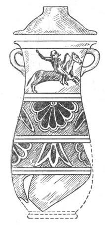 В последних по времени раскопках ялисского некрополя Якопи обнаружил в двух погребениях 2 ситулы, еще более разительно схожие с аналогичными сосудами Дафн. В тех и других полностью совпадает общая композиция орнамента. В простом врулийском некрополе орнаментальная композиция сосудов была гораздо скромнее и проще и не имела фигурного рисунка в своей верхней части. Если на ситулах Дафн мы видели изображение ликийской химеры и крылатого грифона с человеческой головой, то здесь имеем изображение бородатого всадника на лошади (находящего себе аналогию в терракотовых статуэтках Дафн и Родоса) (рис. 28), и изображение явно стилизованной (по типу египетского рисунка) женщины: ноги и лицо изображены в профиль, тело и руки en face. Женщина, по-видимому, держит в руке цветок лотоса. Уже Мэррей высказывал догадку, что отдельные сюжеты ваз и ситул Дафн подчинены интересам сбыта и изготовлялись с учетом вкуса потребителей. Если крылатый человек со змеиным телом и женщина с лотосом были заимствованы из египетского репертуара с греческим их переосмылением, то всадник на лошади (кентавр? Беллерофонт?), отраженный в ряде вотивных статуэток, имел какое-то определенное культовое значение, тогда как химера должна была угождать вкусам карийско-ликийского элемента лагерей.[799]799