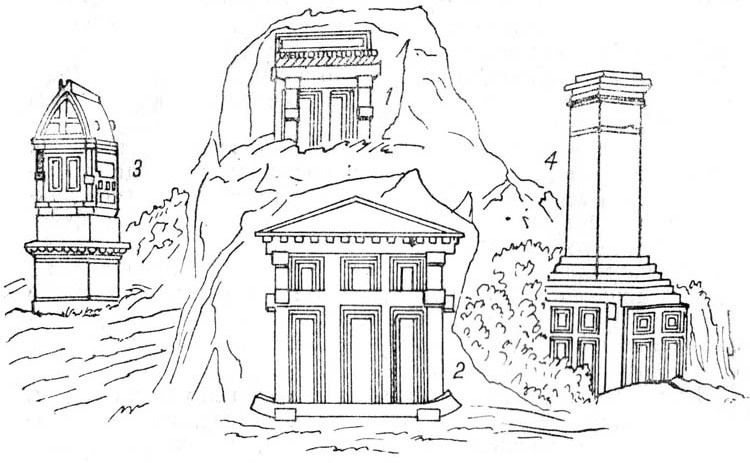 Рис. 30. Четыре типа лидийских гробниц. 1 – каменная гробница. 2 – храмовая гробница. 3 – саркофаг. 4 – tumulus.