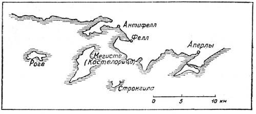 Древний город Мегисте был построен на вершине скалы, господствующей над гаванью, и укреплен мощной стеной, остатки которой были еще видны на поверхности в XIX в. (рис. 33). Таким образом, система укреплений родосской колонии свидетельствует о том, что остров был захвачен силой и представлял родосскую базу военно-сторожевого характера. Родосские торговые корабли могли найти здесь безопасную стоянку на полпути к Фаселиде.