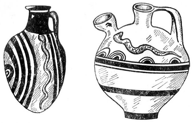 Хтонический характер культа змеи является общепризнанным, и в этом отношении связь минойских трубчатых сосудов со змеей – чрезвычайно показательна. Мы уже видели, что на Родосе этот сосуд, геометрически орнаментированный, входит в состав предметов храма, тесно связанного с культом мертвых героев, на наличие которого указывает ботрос. Сосуд сохраняет еще здесь змею минойского времени. На аналогичных сосудах, перешедших по наследству в классическую Грецию, в технике ранней чернофигурной живописи вместо змеи появляется рисунок, более понятный современникам: Харон, перевозящий на челноке через Стикс умершие души[91]91