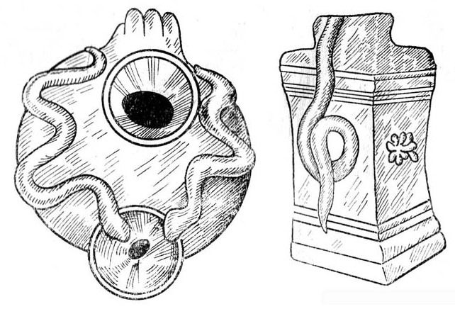 К сожалению, головы змей, края чаши и верхние углы алтаря разрушены. Пластичные и живописные изображения змей на надгробных памятниках вообще широко распространены; материал собран и сопоставлен у Гарриссон. I. Е. Harrisson. Prolegomena to the study of Greek religion. Cambridge 1908, стр. 326 сл., рис. 97 сл. Ср. также: В. Клингер. Животное в античном и современном суеверии. Киев, 1911, стр. 155 сл.